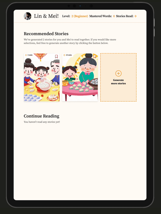 Personalized stories generated with AI. We included this feature because stories with the child’s interests in mind are more engaging and would increase motivation.